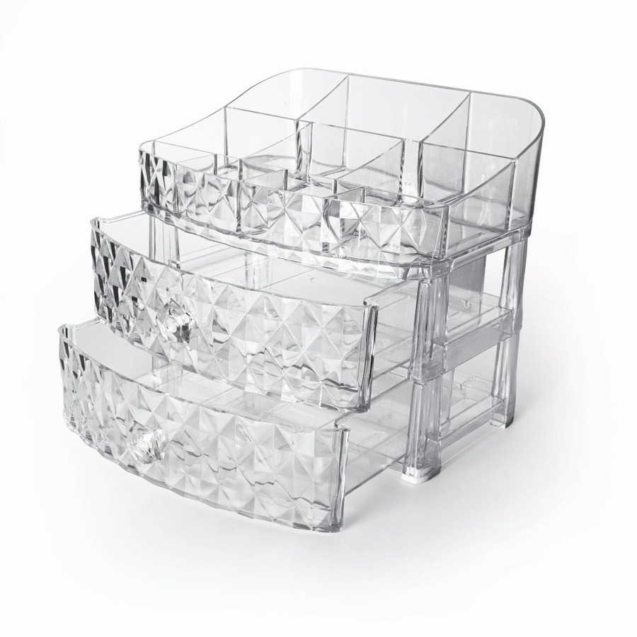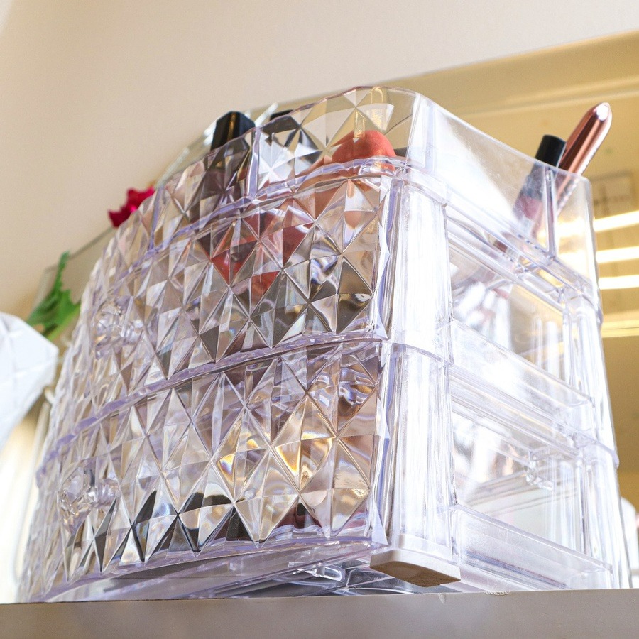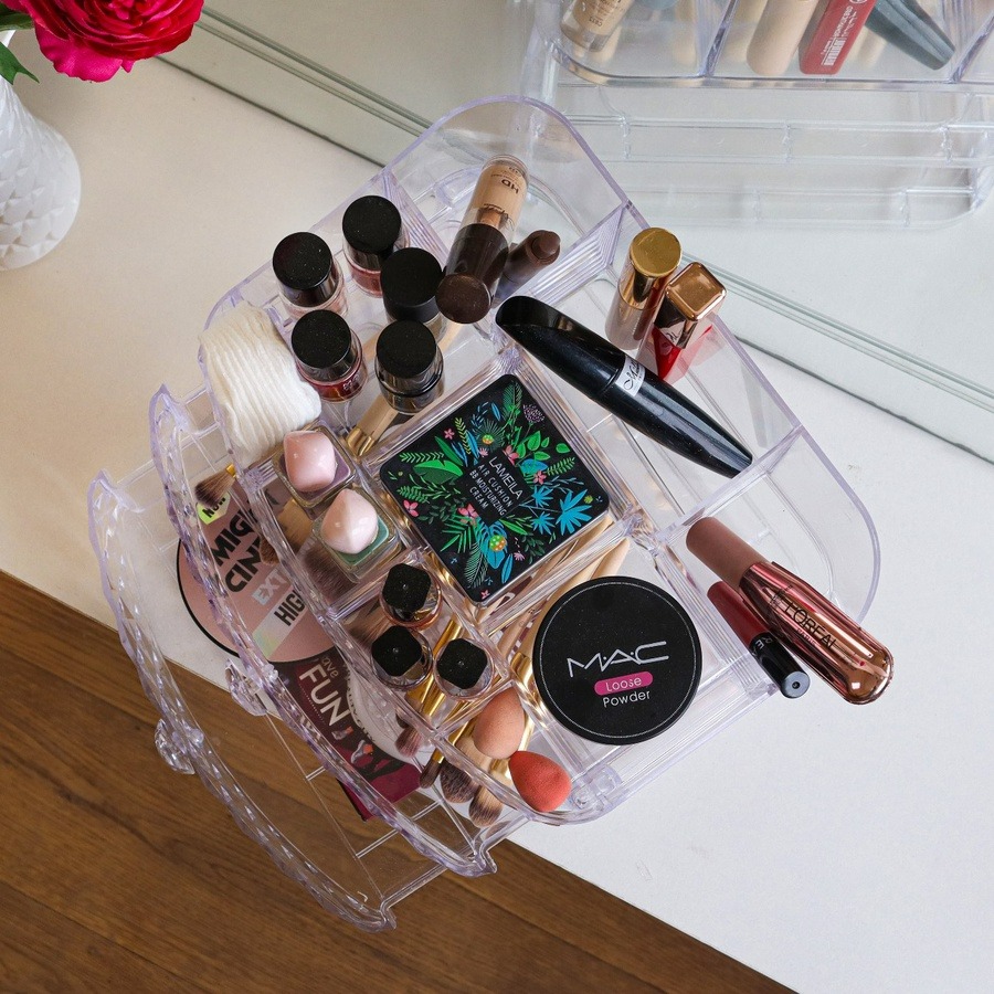مصنوعة من أكريليك كريستال شفاف بجودة عالية يخلي شكلها فخم وراقي، صغيرة في الحجم لكن كبيرة في الاستيعاب؛ بتشيل فرش، روج، مسكرا، بودر، إسفنج، عطور صغيرة… وكل حاجة تبقى في مكانها.